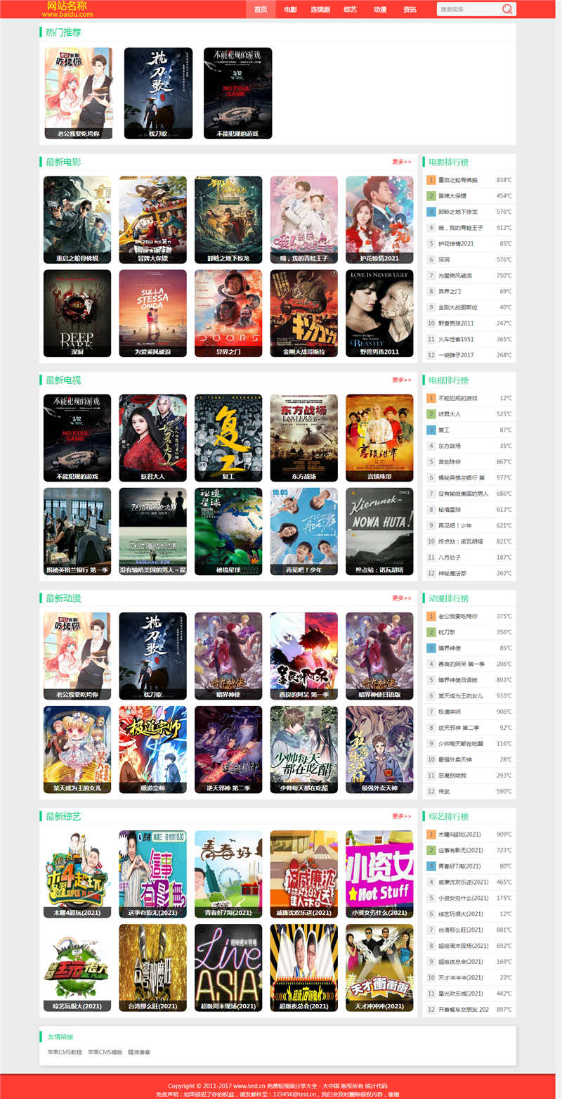 | 苹果CMS模板简介: 苹果cms简洁自适应主题模板,苹果CMSV10模板,已测试,完美无错。 自适应手机端,只有影视模块,修复友情链接调用。 苹果cms模板安装方法:上传到template目录,然后后台设置模板就可以了。 资源截图: |