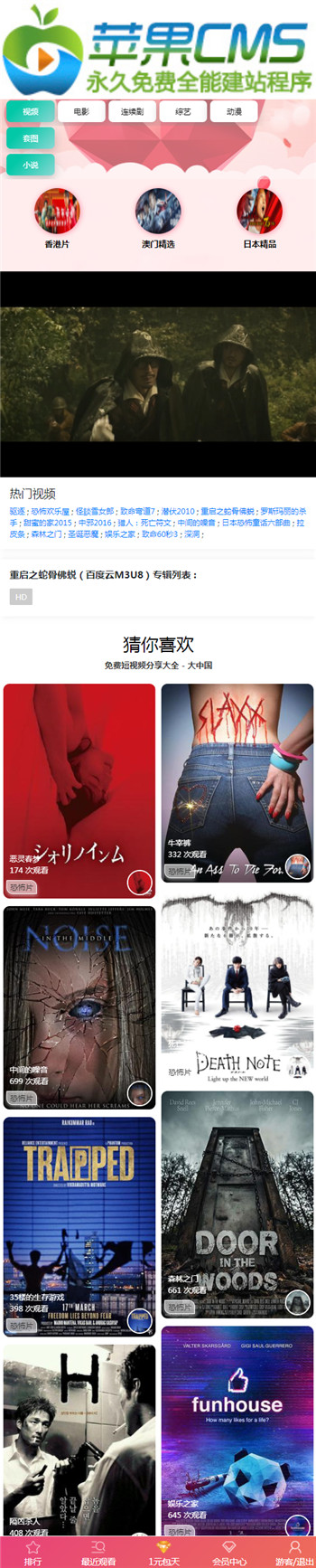 | 苹果CMS模板介绍: 初恋视界主题苹果CMS手机模板,初恋视界主题,苹果CMSV10手机模板,免费下载。 VIP会员制度:可对会员进行权限是设置及时间限制 三级分销:每个会员后台都有自己的推广地址,凡是从推广地址进行注册的会员都会成为下级 推广:通过推广链接获得积分 在线支付:支付宝、微信、码支付等等;不能以自己不会申请支付帐号而要求退款。 采集:可以使用接口进行采集,可以自己写采集规则;不能以不会找资源或不会写规则而要求退款 积分:可对每部视频进行积分设置 播放器:内嵌多种播放器,可轻松解析M3u8格式视频,或者自行在播放器内输入解析地址。 三大板块综合:视频板块:在线视频播放列表页及视频播放页面 图片板块:图片列表页及图片图集显示页面 小说板块:小说列表页及小说显示页面 苹果CMS模板安装教程:环境要求:Php5.6+mysql5.6+Apache2.4.48或Nginx1.15.10 安装说明:模板为完整苹果CMS源码,需要导入数据库;如果你怕不安全,也可以只安装模板,自行下载苹果CMS。 1、上传~到根目录后,再导入数据库(sql.sql) 2、修改APPlication/database.php路径 3、后台:http://您的网址/admin.php,账户admin密码wap.zyzyw.cc 4、搭建好先到后台网站配置方法看附件说明 |