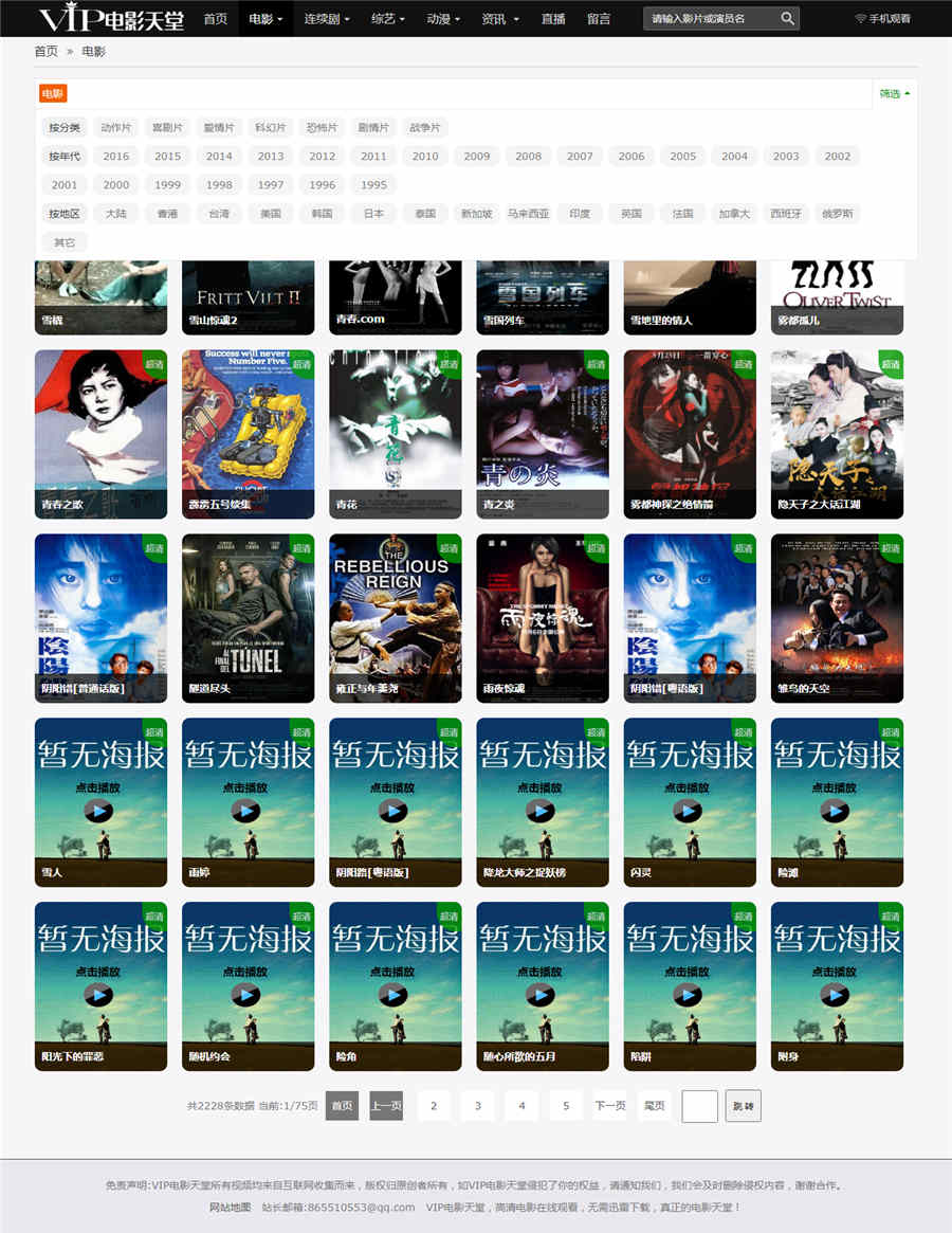 模板介绍: 仿VIP电影天堂影视网站模板,苹果CMSV8版本,自适应手机端,黑色风格。已测试完美无错,删除了部分失效代码。 包含影视模块和新闻模块,影视模块测试没有问题,新闻模块没找到测试资源,没测试,目测也应该不会有问题。 包含畅言的评论代码,不需要的可以删除,具体大家看演示截图就行。 模板截图 |